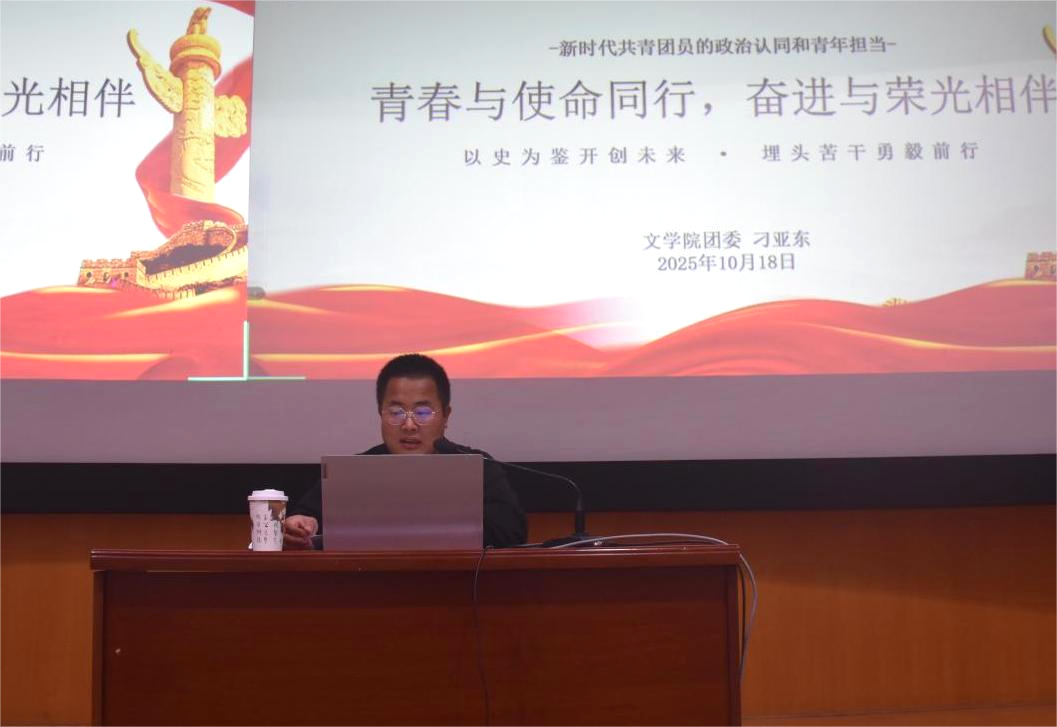 兰州大学文学院团委书记刁亚东老师以“青春与使命同行,奋进与光荣相伴”为主题,带领学员们回顾和学习了共青团的发展历史,他鼓励青年学子们要以历史浇铸信仰,以担当践行使命,做埋头苦干、勇毅前行的新时代共青团员。