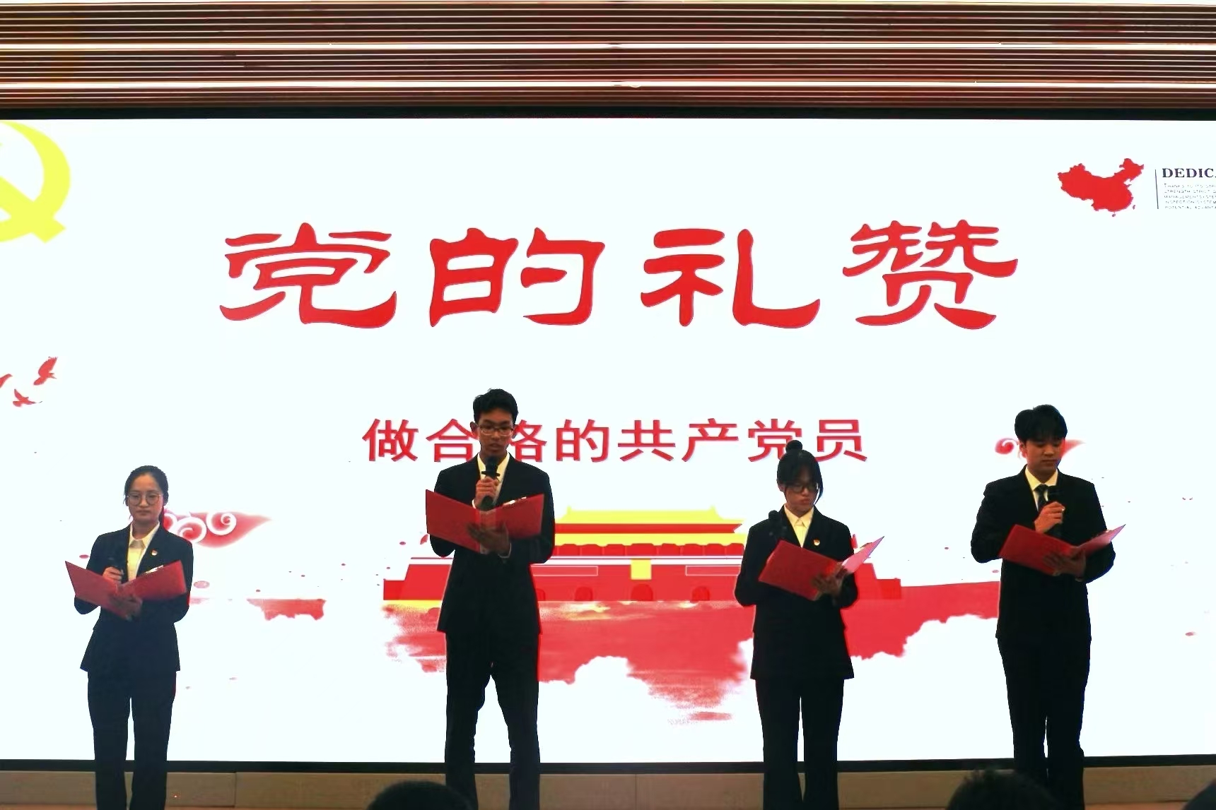 在选手们精彩的演讲结束后,地质科学与矿产资源学院本科生党员代表张玉芸、沈俊辰、马璇、王搏翔同学为大家带来诗朗诵《党的礼赞》,娓娓道来在中国共产党的领导下,中华民族由贫弱走向富强、从落后迈向先进。
