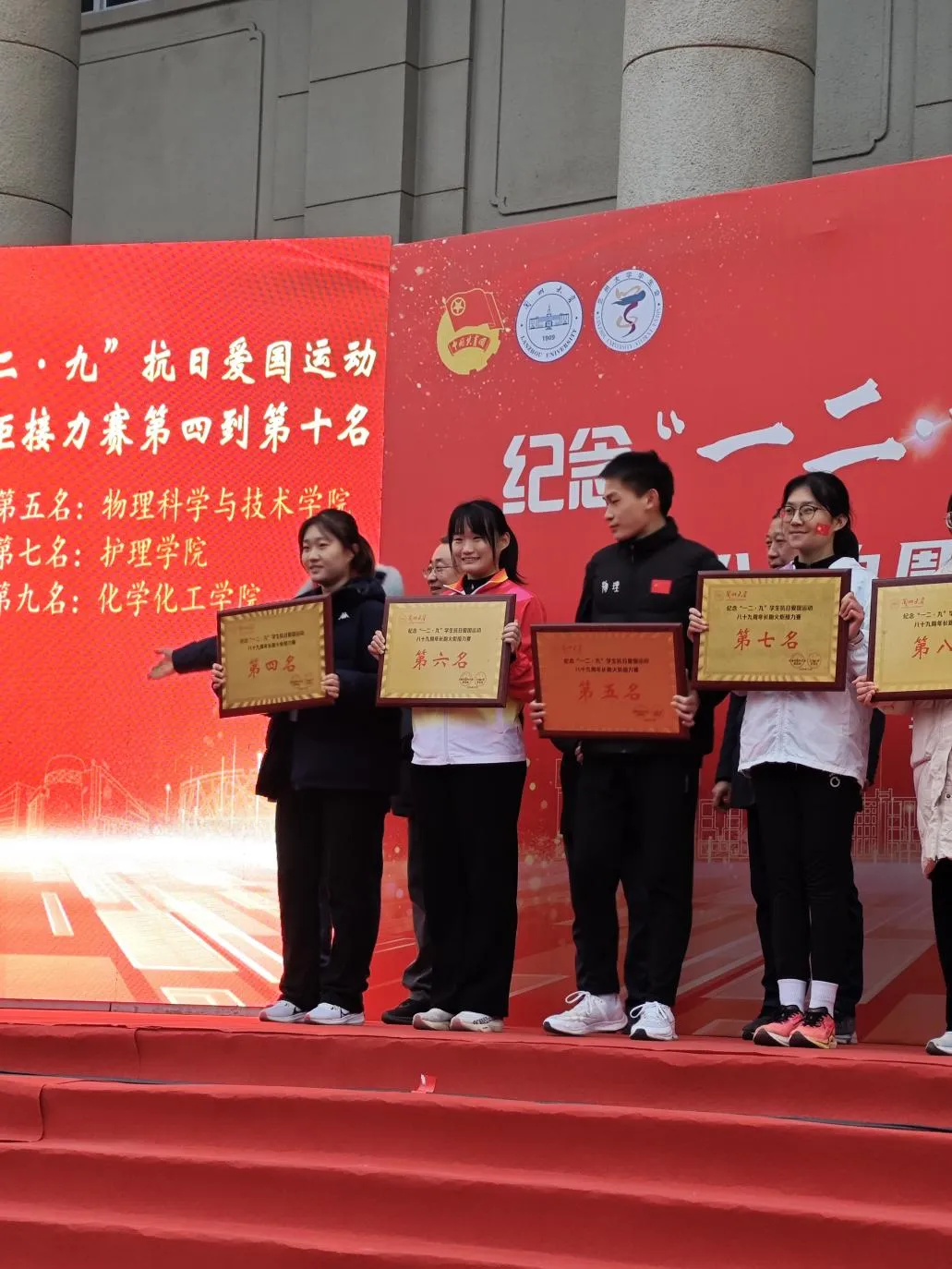 为纪念“一二·九”学生抗日救亡爱国运动,弘扬爱国主义精神和体育精神,促进学生全面发展,12月9日下午,兰州大学在榆中校区举办纪念“一二·九”运动长跑接力赛。我院学子积极备赛、热情参与、表现优异,荣获第六名的好成绩。