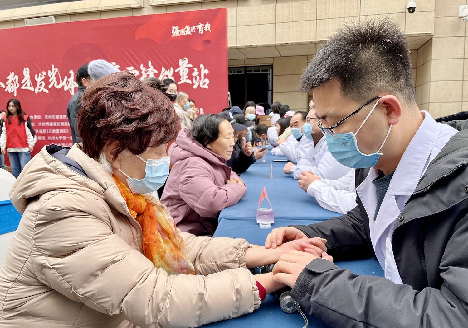 上午9时30分,酒泉路社区的活动场地上已聚集众多闻讯而来的居民。来自兰大一院普外科、心内科、消化科、骨科、神经外科、康复医学科、综合内科、中医科、内分泌科等科室的专家团队搭建起"移动门诊",为社区居民提供疾病咨询、用药指导、中医体质辨识、糖尿病患者饮食管理等健康义诊服务。医学生志愿者们在老师的指导下,规范开展血压、血糖测量服务,发放降压降糖药物。