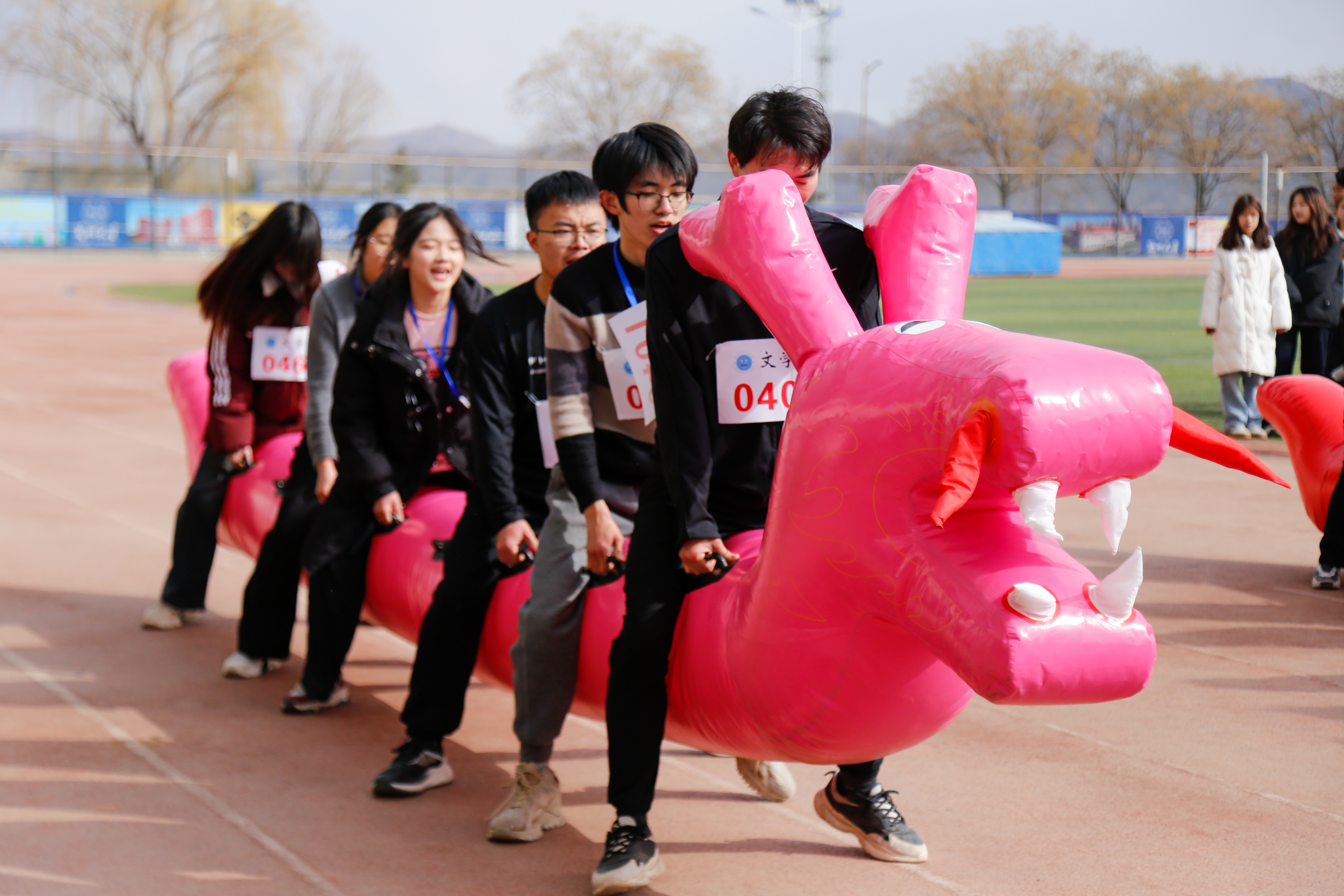 开幕会结束后,首先举行了师生趣味项目比赛。一场酣畅淋漓的师生拔河比赛作为热身活动,瞬间点燃了运动会现场,场上的加油声、欢呼声此起彼伏。在旱地龙舟赛、众星捧月等项目中师生既相互竞争又相互鼓励,配合默契,同赛同乐。
