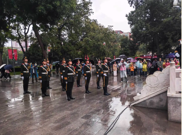 绵绵细雨中,每一位兰大学子都仪表整齐,庄严伫立,等待着神圣的一刻。国旗护卫队身着戎装,目光坚毅,身姿挺拔,迈着整齐的步伐走到升旗台下。他们用踏响的正步践行着“护卫国旗,重于生命”的誓言。