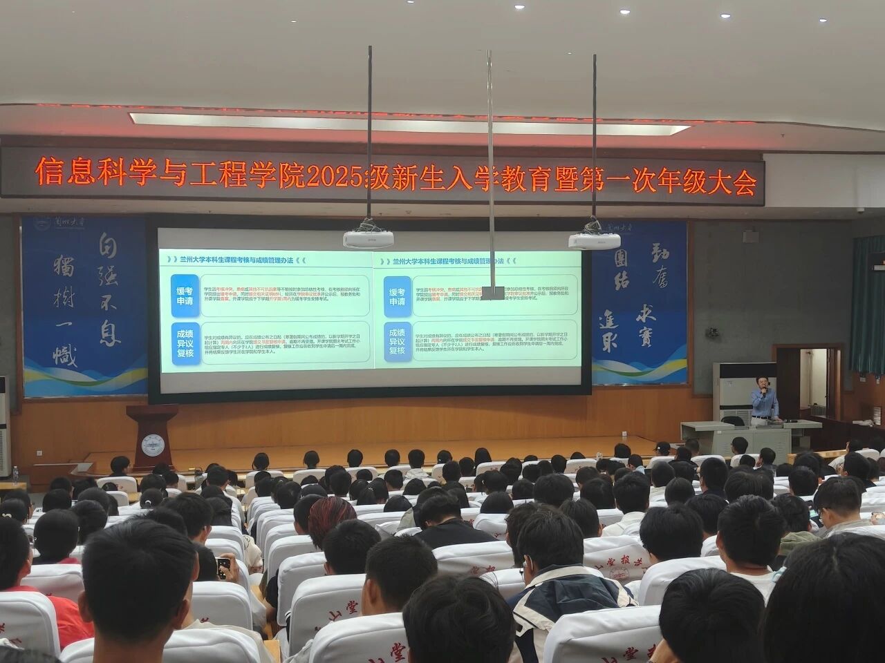兰州大学信息科学与工程学院于2025年9月25日下午在天山堂C302召开新生入学教育暨年级大会。学院党委副书记郁刚、教学秘书杨皓、辅导员石芯月、兼职辅导员胡锦良及全体2025级本科生参会。