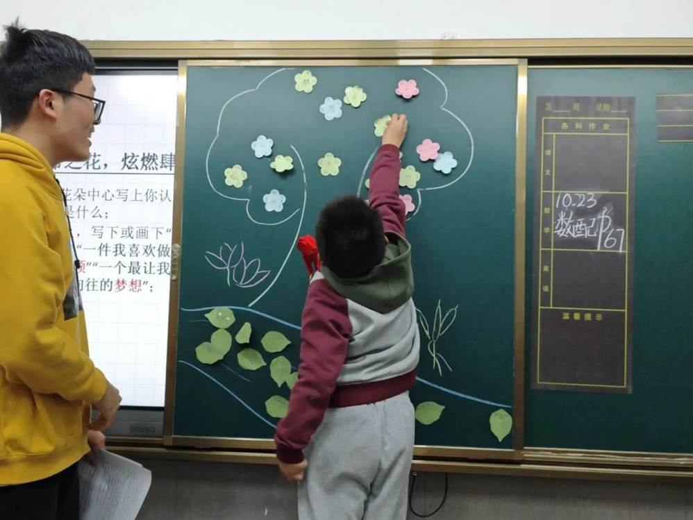 志愿者向学生分发空白“生命之花”便签,要求孩子们在花心书写“生命”二字,在花瓣上写下“爱的家人/朋友”“喜欢的事”“向往的梦想”等内容;随后邀请学生上台展示作品,再将所有“生命之花”贴于黑板树枝,构成“生命花园”。此环节让学生清晰认知“生命是一切美好事物的根基,理想与奋斗又让生命绚丽绽放的道理”,进一步深化对生命价值的理解。