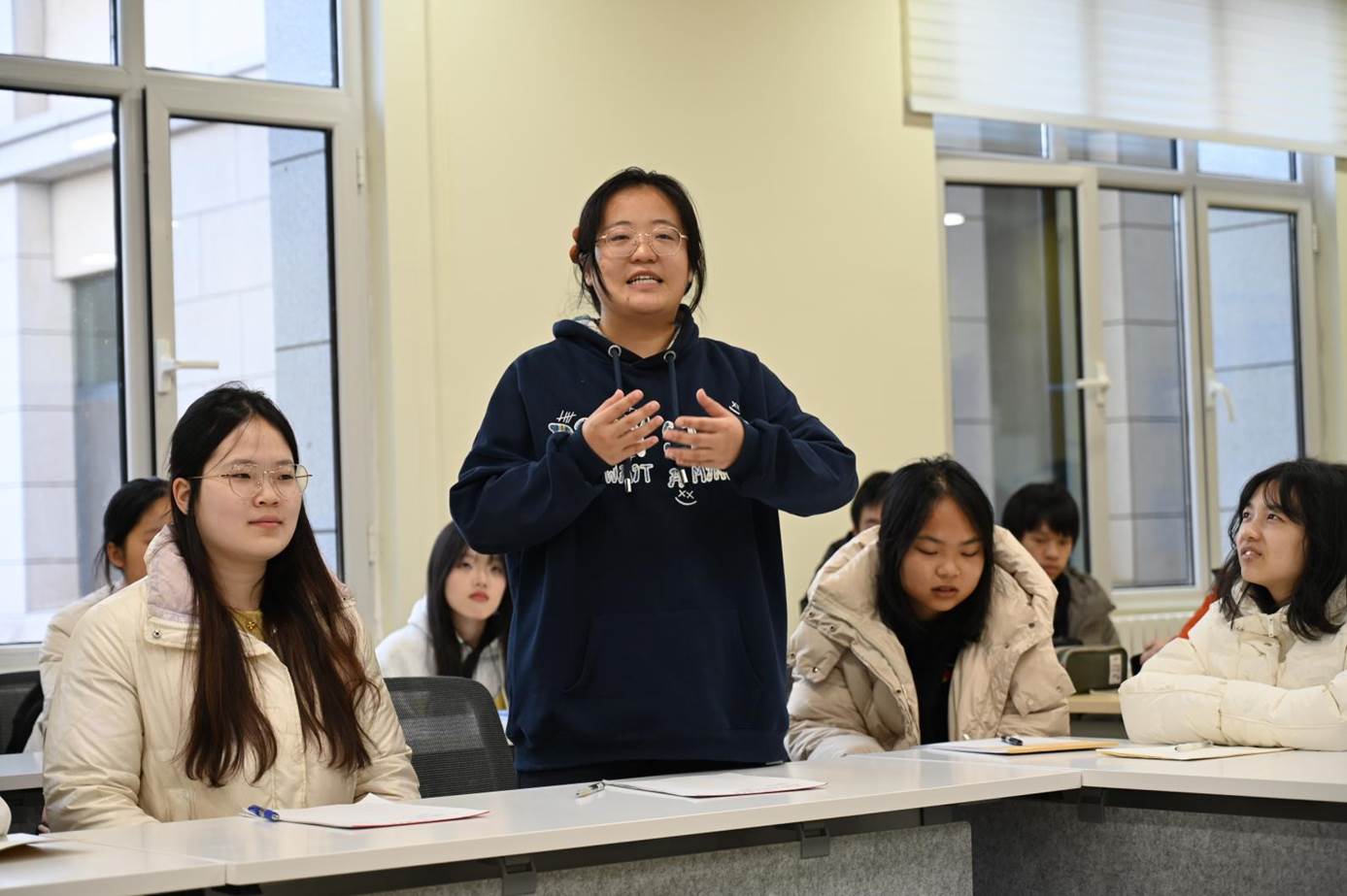 2024级大气科学1班班长王彦博作《“云途共济”五维共生型班级成长领航工程》“百优班级”建设汇报,详细展示了同学们在学风建设、科研竞赛、文化浸润等方面的举措与成效,充分体现了互帮互学、共同进步的优良学风。在“我的班级我的家”微分享环节,同学们分享了日常生活中相互关心、彼此扶持的温暖点滴,让“班级”二字充满了家的温度,生动展现了和谐友爱的集体氛围。