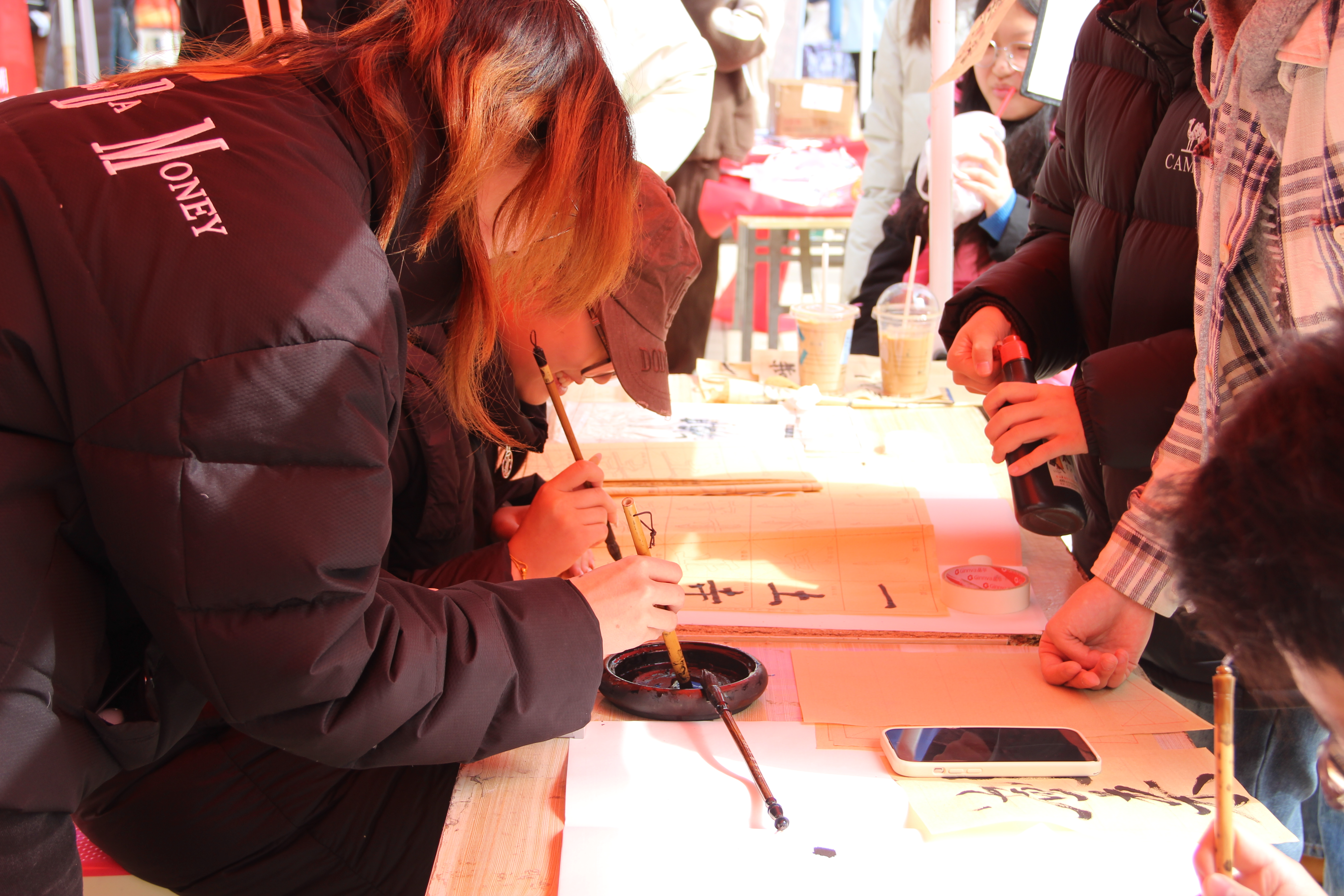 活动当天,视野广场气氛热烈,前来参与的同学络绎不绝。现场精心设置了书法创作区和绘画体验区两大板块,配套准备了笔墨纸砚、颜料画笔等充足物资,吸引了近百名师生驻足参与、沉浸式体验。